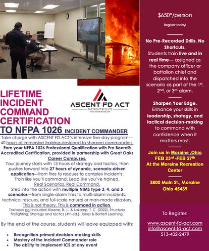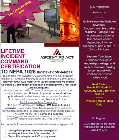 ASCENT FD ACT offers training for NFPA Professional Qualification 1026. Pro Board ® Accredited Certification to NFPA 1026 is provided through our partnership with Great Oaks Career Campuses.